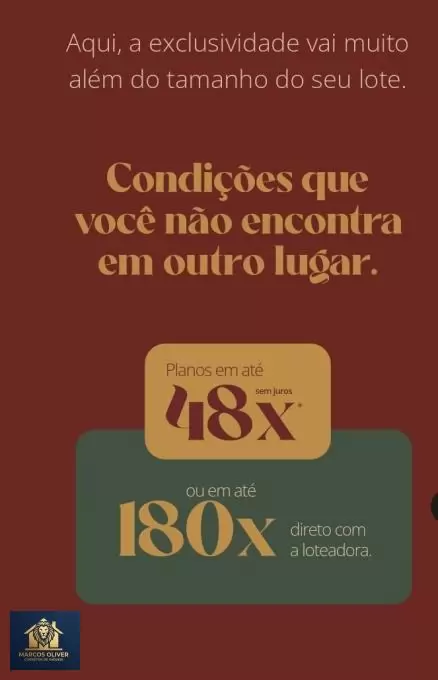 São lotes a partir de 360m² com valores a partir de R$ 340.000,00 e financiamento direto com o incorporador com condições comerciais exclusivas!